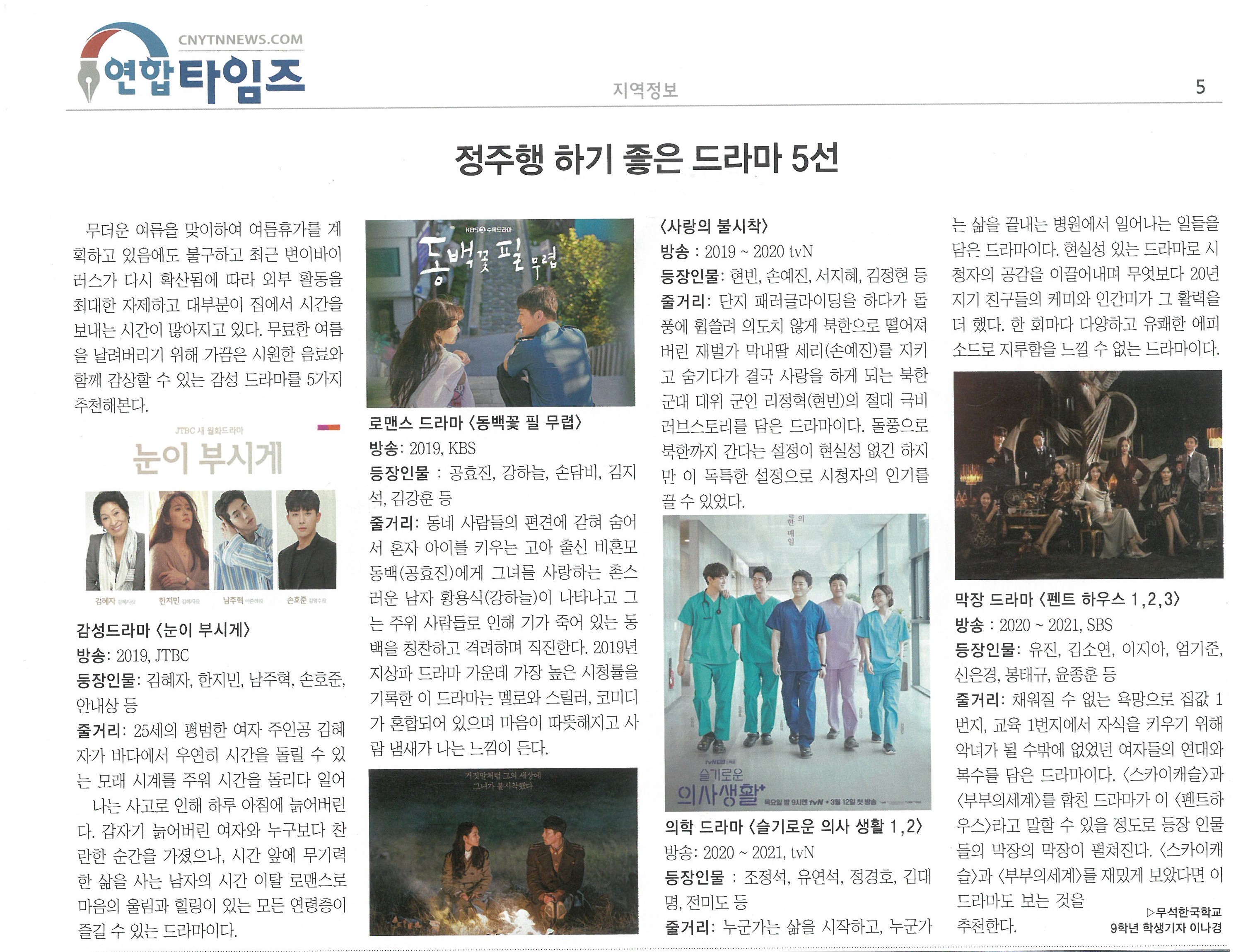 ¹«´õ¿î ¹æÇаú Äڷγª È®»êÀ¸·Î ÀÎÇÑ ´ë¿ÜȰµ¿ Á¦ÇÑÀ¸·Î ÀÎÇØ Çлý±âÀÚ À̳ª°æ(9Çгâ)ÀÌ "Á¤ÁÖÇàÇϱâ ÁÁÀº µå¶ó¸¶ 5¼±"À̶ó´Â ±â»ç¸¦ ÀÛ¼ºÇÏ¿© 8¿ù 6ÀÏ ¼ÒÁÖ¿¬ÇÕŸÀÓÁî¿¡ ±â°íÇÏ¿´½À´Ï´Ù.